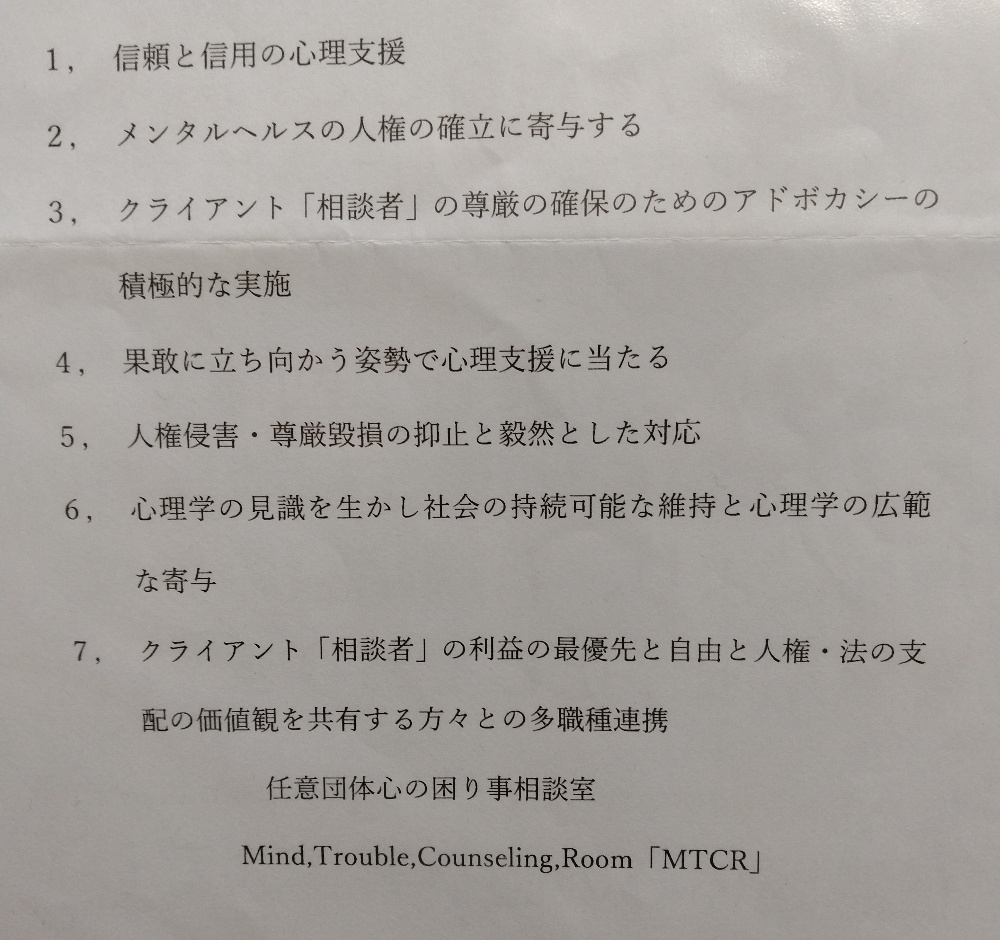 1,任意団体心の困り事相談室「MTCR」は、世界人権宣言・国連人権諸規約にて構成する国際人権法とビジネスと人権に関する指導原則及び国内行動計画・任意団体心の困り事相談室「MTCR」人権基本方針に沿ってあらゆる形態の差別やハラスメントも容認せず、基本的人権の尊重と擁護を推進します。